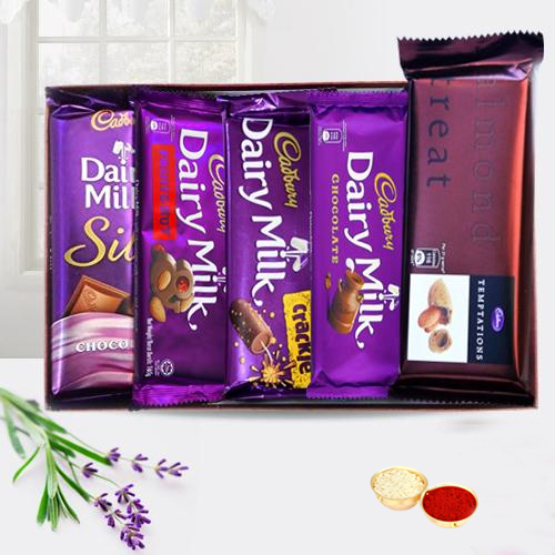 Cadburys Chocolates is a household name for years. In this pack Cadburys has combined Cadbury Dairy Milk Silk, Cadbury Dairy Milk Fruits Nuts, Cadbury Dairy Milk Crackle, Temptation and Cadbury Dairy Milk together with free Roli Tilak and Chawal.