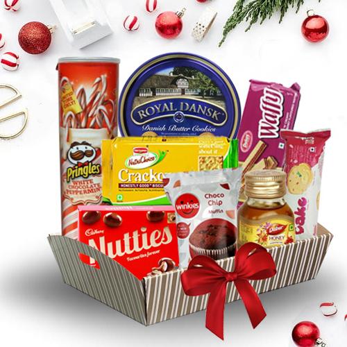 Send this exciting gift of Enticing Snacks Tray that brings exclusive happiness. This gaudy looking Chest is launched with Tea Time Hamper containing Britannia Fruit Cake, Winkies Cup Cake, Pringles Small Chocolate, Waffy Wafers, Dabur Honey, Britannia Cream Cracker and a Cadbury Nutties Box. Note: Gift container may vary depending on availability.