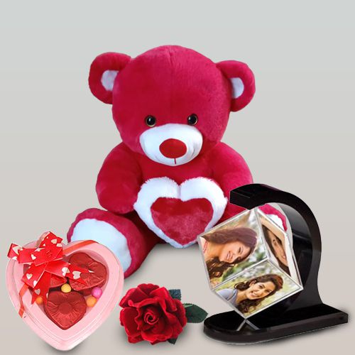Make a love statement on Valentines Day with this gift of Appealing Love You Lots Personalized Photo Gift Combo which is filled with your good wishes. This Combo is ideal for your Girlfriend as it include: - Personalized Photo Magnetic Revolving Stand, - 3 pcs Heart Shape Handmade Chocolate, - Valentine Red Teddy and - Red Velvet Rose. Please send a High Resolution Photo or Your Personalized Message that needs to be added to the product at [email protected] along with you’re Alphanumeric Order Number.