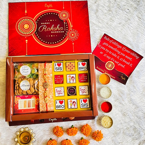 This gift set has:  One Designer Rakhi for Brother  12 Pieces of Rich and Creamy Luxury Handcrafted Chocolates   - Flavors: Roasted Dry Fruit Filling, Cranberry Filling, Paan Filling, Butterscotch Filling, Mix Fruits Filling, Chocochip Filling   - Theme: Rakhi theme Digital Print On box Top and on Chocolates   - Shelf Life: 3 Months  Almonds 60 gms  Dried Mixed Fruits 60 gms  Complementary Set of Roli Tikka, Chandan, Chawal, Mishri  Rakhi Greeting Card Send to your dear ones, auspicious Raksha Bandhan wishes with this Classic Rakhi with Chocolates Extravaganza. This Designer Metal Mauli Rakhi with multicolored pearls will look very elegant on your brother.
