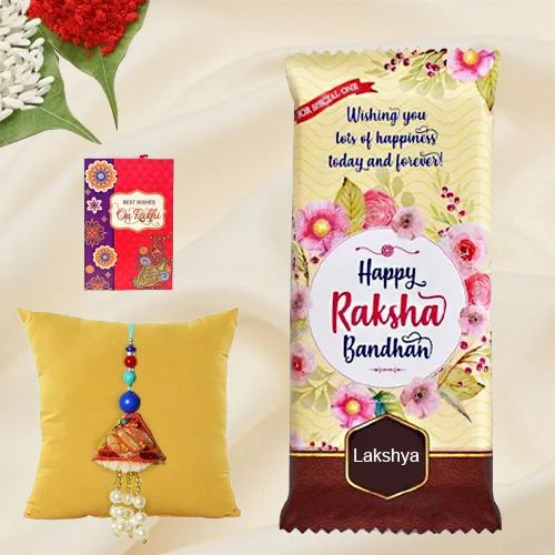 This Rakhi gift comprises of : • A Personalized Hersheys Milk Chocolate Bar, • A Fancy Rakhi for Sister • A Free Rakhi, Roli, Tika and Chawal. Delight your sister this Raksha Bandhan with a unique gift set that blends warmth, tradition, and sweetness. This carefully curated combo features a Personalized Hershey’s Milk Chocolate Bar that lets you add a custom message or name to make your gift one-of-a-kind. It also includes a beautifully adorned Fancy Rakhi for your sister, crafted to reflect the love and bond you share. Completing the set are essentials for the rituals—Roli, Tika, and Chawal—along with a complimentary Rakhi to add to the festive cheer. This Rakhi combo is the perfect balance of tradition and personal touch for a truly memorable celebration.Details needed: Send a digital Message with your Alpha-numeric order id at: [email protected] or Whatsapp at +91 9230721098.