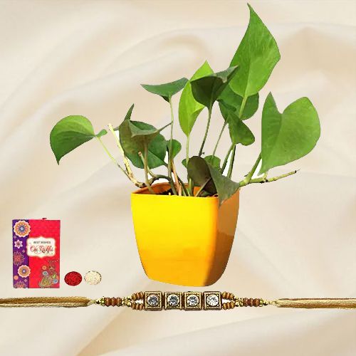 This is a gift of: A Stone Studded Rakhi A Money Plant in Pot Free Rakhi Free Roli, Tilak and Chawal Have a wonderful Raksha Bandhan with your Brother and family members with this Beautiful Collection of Money Plant in a Pot with Stone Stud Rakhi along with free Roli, Tika and Chawal that will surely make them happy on this day.