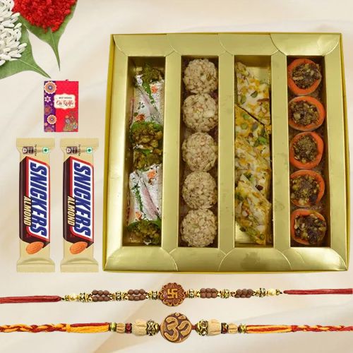 This gift combo includes: A Box of Assorted Sweets (500 gms) Set of 2 Auspicious Rakhi Snickers Almond Chocolate Bar (2 pcs x 25g each) Free Rakhi, Roli Tika N Chawal included Surprise your brother with this charming Rakhi combo that includes a mix of traditional and fun elements. Inside, youll find a 500 gms box of assorted sweets, a set of 2 auspicious rakhis, and two Snickers Almond Chocolate Bars (25g each) for an irresistible treat. The hamper also comes with a complimentary rakhi, roli tika, and chawal, offering a complete and memorable Raksha Bandhan experience.