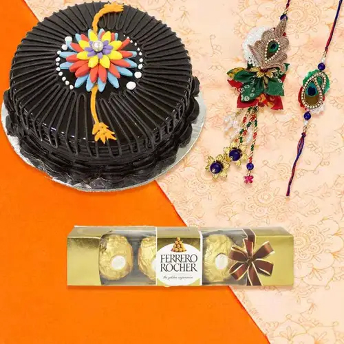 Fashionable Bhaiya Bhabhi Pair Rakhi with Chocolate Cake and Ferrero Rocher Chocolate