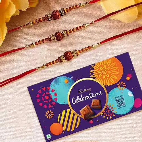 Splendid Rudraksha Rakhi Trio with Cadbury Celebration Gift Pack