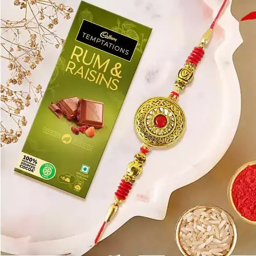 Product Details This is a gift of : • One Stone Studded Rakhi - Type: Designer Rakhi - Colour: Multi colour - Suited for: Brothers - Rakhi Code: KPRK0313 • A Cadbury Temptations Rum and Raisins • Complimentary Roli, Tika and Chawal • A Free Rakhi Greeting Card Also Included Gift your brother a beautiful multi-colour Designer Stone Studded Rakhi (Rakhi Code: KPRK0313) that stands out with its intricate design and sparkling stones. Complemented by a delectable Cadbury Temptations Rum and Raisins chocolate, this set adds a delightful touch to your Raksha Bandhan celebrations. The traditional essentials—Roli, Tika, and Chawal—are included free of charge to complete the customary rituals. To make the occasion even more special, a free Rakhi Greeting Card is provided, allowing you to share your love and heartfelt wishes. This all-in-one Rakhi set is a perfect blend of tradition, taste, and thoughtful gifting.