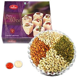 500 Gms. Haldirams Soan Papri with 300 Gms. Almonds, Raisins & Cashew Nuts. (Free Roli and Tika)
