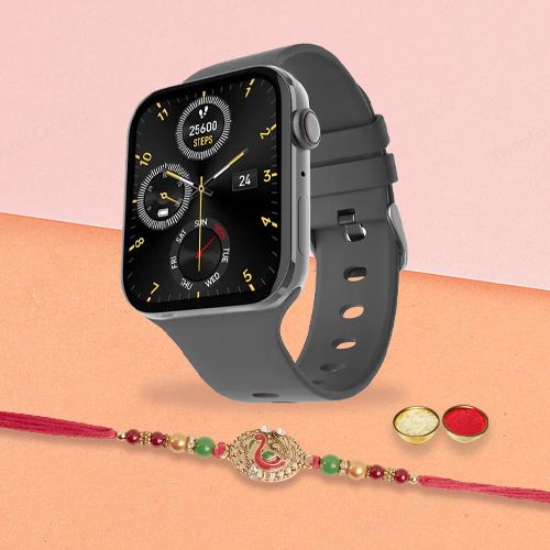 This Gift Hamper contains: A Kundan Rakhi by Rakhi Sutra (KPRK0289) Fire-Boltt Visionary AMOLED Smart Watch (Dark Grey) Complimentary Roli Tika N Chawal Complimentary Message Card with Free Rakhi Experience the perfect blend of tradition and modernity with our Kundan Rakhi N Fire-Boltt Smartwatch Combo. This thoughtfully curated gift set features a stunning Kundan Rakhi designed by Rakhi Sutra, symbolizing love and protection. Alongside, the Fire-Boltt Visionary AMOLED Smart Watch in Dark Grey is perfect for todays tech-savvy brother. To add a traditional touch, the hamper includes complimentary Roli Tika N Chawal for the ceremony and a lovely message card for your special note. Show your love this festive season with a combination that speaks to both heart and style.