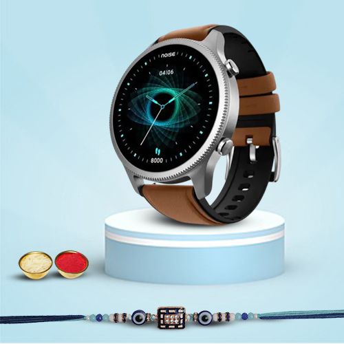 This Gift Hamper contains: An Evil Eye Rakhi by Rakhi Sutra (EVD0475) NoiseFit Halo Round Dial Smartwatch with BT Calling (Vintage Brown) Complimentary Roli Tika N Chawal Complimentary Message Card with Free Rakhi This Raksha Bandhan, elevate your gifting game with our exclusive Evil Eye Rakhi and Smartwatch set. The Evil Eye Rakhi by Rakhi Sutra symbolizes protection and goodwill, making it an ideal way to celebrate your siblings safety. Complemented by the NoiseFit Halo Round Dial Smartwatch in Vintage Brown, this set is perfect for the modern sibling who values both fashion and utility. Additionally, the gift includes traditional Roli Tika N Chawal and a heartfelt message card. Show your sibling just how much they mean to you with this perfect blend of tradition and tech.
